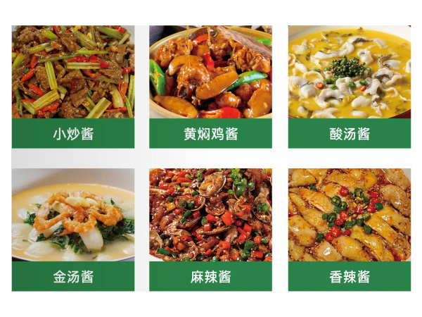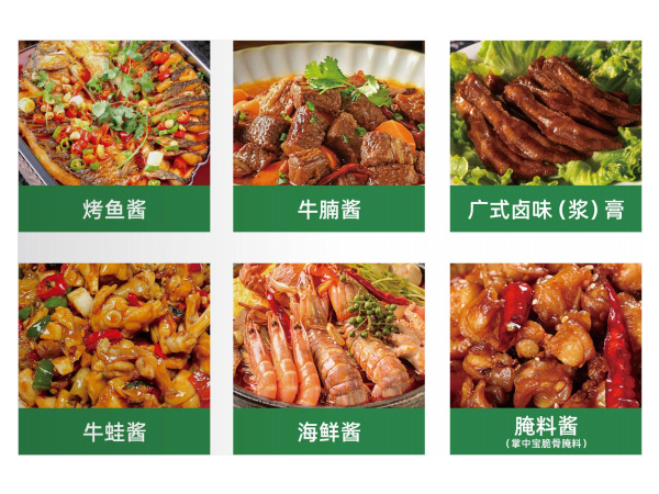 小炒酱、黄焖鸡酱、酸汤酱、金汤酱、麻辣酱、香辣酱、烤鱼酱、牛腩酱、广式 卤味(浆)膏、牛蛙酱、海鲜酱、腌料酱(笔中宝脆骨腌料)。